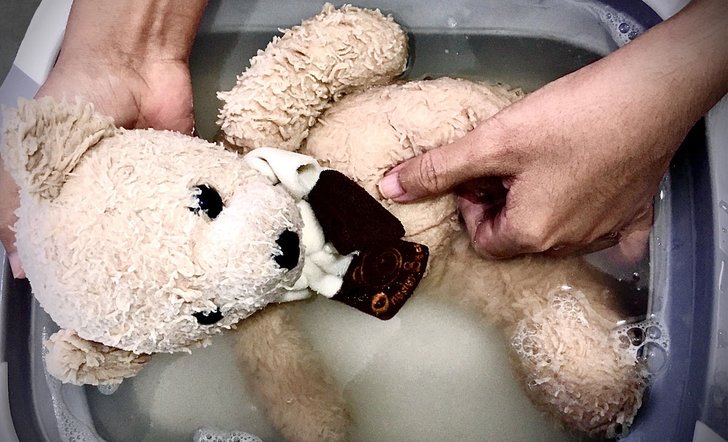 นำน้ำร้อนใส่ลงในภาชนะและเทแชมพูเด็ก หรือสบู่เหลวไปผสมกับน้ำ นำตุ๊กตาลงไปแช่ ใช้ผ้าเช็ดที่ตุ๊กตาเบาๆทุกซอกมุม เมื่อเสร็จแล้วให้เทน้ำทิ้งจากนั้นจะเป็นการล้างโดยให้เทน้ำร้อนลงในกะละมังอีกรอบ จากนั้นนำผ้าเช็ดตัวมาซับน้ำออกจากตัวตุ๊กตาให้แห้งที่สุด ก่อนนำไปตากแดด
